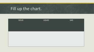 This document discusses materials that can absorb water. It defines absorption as taking in liquid gradually and naturally. It instructs students to classify examples like paper, cotton balls, and towels as absorbing or not absorbing water. Students are then asked to collect 10 materials from home to test which absorb water and record their findings.