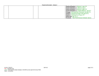 This transition document summarizes the key ideas around teaching mixtures and solutions to 4th grade students. It compares the 2010 and 1998 Texas Essential Knowledge and Skills standards, noting performance indicators and lesson considerations. Students will compare and contrast different mixtures and solutions, such as rocks in sand or sugar in water. They will create a graphic organizer to observe, measure, record, and describe the properties of substances to determine if they are a mixture or solution. Lessons from 5th grade CSCOPE materials on mixtures and solutions can be adapted for the 4th grade standards.