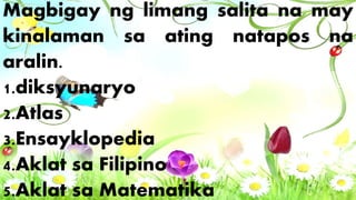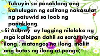 Ang dokumento ay naglalaman ng mga salitang may kaugnayan sa aralin, kasama ang mga halimbawa ng paggamit ng mga ito sa pangungusap. Tinalakay nito ang mga impormasyon tungkol sa mga sinaunang tao sa Pilipinas, kanilang mga katangian, at ang kanilang mga ninuno. Nagbigay din ito ng mga hakbang kung paano ipapahayag ang mga narinig sa pamamagitan ng pangkatang gawain at pagbabalanse ng impormasyon.