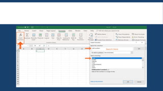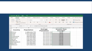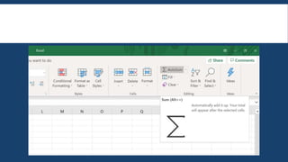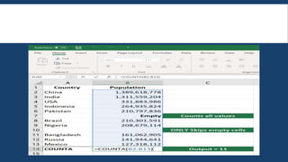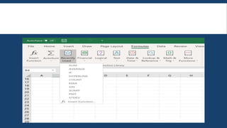 This document provides an overview of basic Excel formulas for beginners. It defines formulas and functions, and describes five common ways to insert formulas in Excel, including typing directly in a cell or using the Insert Function option. Seven basic formulas are also outlined: SUM, AVERAGE, COUNT, COUNTA, IF, TRIM, and MAX/MIN. The document recommends additional resources for continuing to develop Excel skills.