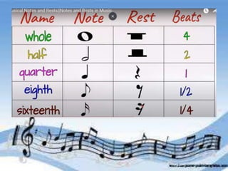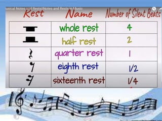 Understanding the relationship between notes and rests is essential for reading music. Notes represent sounds while rests represent silences. The document discusses types of notes and their visual representations, emphasizing the identification of notes and rests.