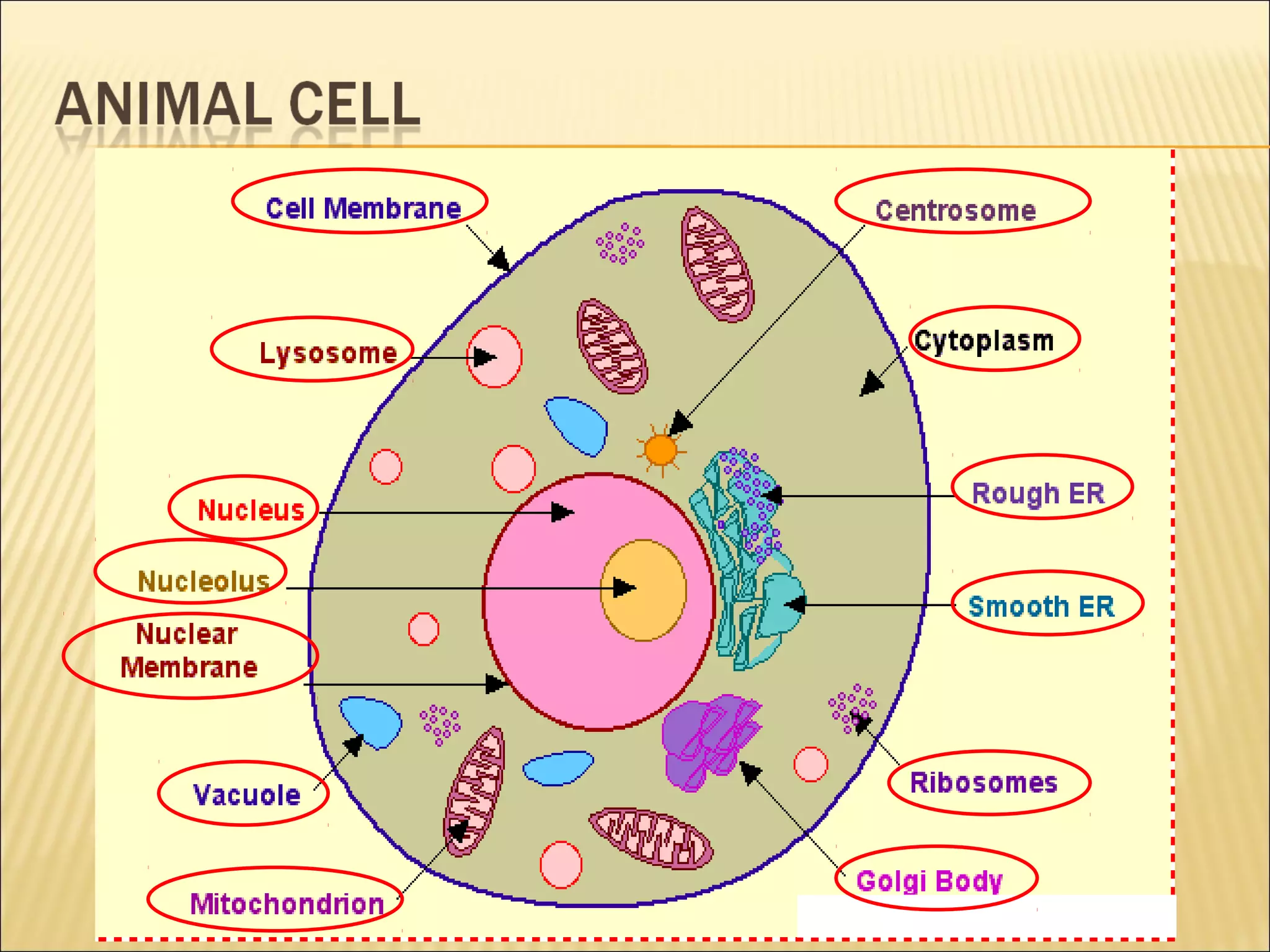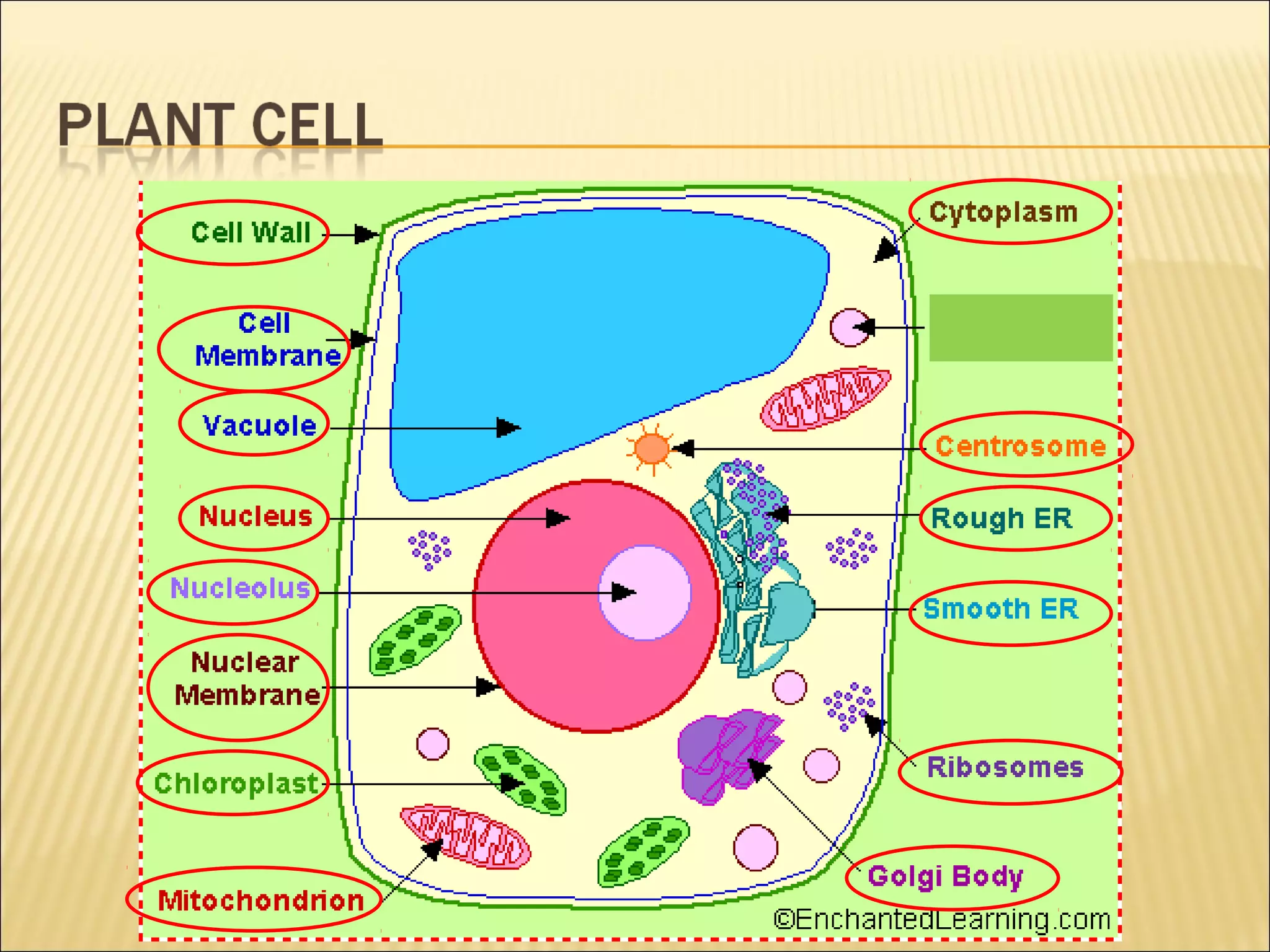 This document describes the structure and functions of various organelles found within cells. It explains that the cell membrane controls movement in and out of the cell, and that the cell wall supports and protects plant cells. The nucleus contains genetic material and is surrounded by the nuclear membrane. The endoplasmic reticulum helps transport proteins, with the smooth ER involved in fat synthesis and the rough ER containing ribosomes. Mitochondria produce energy and the Golgi apparatus packages proteins for transport. Lysosomes digest materials and vacuoles store reserves and control water levels. Chloroplasts are found in plant cells and are the site of photosynthesis.