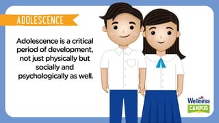 The document discusses the physical, social, and psychological changes that occur during adolescence. Physically, males and females experience changes like increased height and weight, development of sexual organs, and onset of menstruation in females. Adolescents also experience more independence from parents and expanded social circles. Their busy schedules can lead to improper eating habits like consuming fast food and sugary drinks. The document emphasizes the importance of adolescents making wise food choices and eating a balanced diet to support their development and changing nutritional needs.