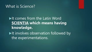 Science involves observation and experimentation to build knowledge about the natural world. It is an ongoing process of investigating through questioning, observing, experimenting and predicting. Superstitions are beliefs that are not scientifically tested, while science seeks to understand nature through reasoning and evidence-based experiments. The main branches of science are natural sciences like physics, chemistry and biology, which study different aspects of the natural world, and social sciences like economics, history and sociology that focus on understanding people and societies.