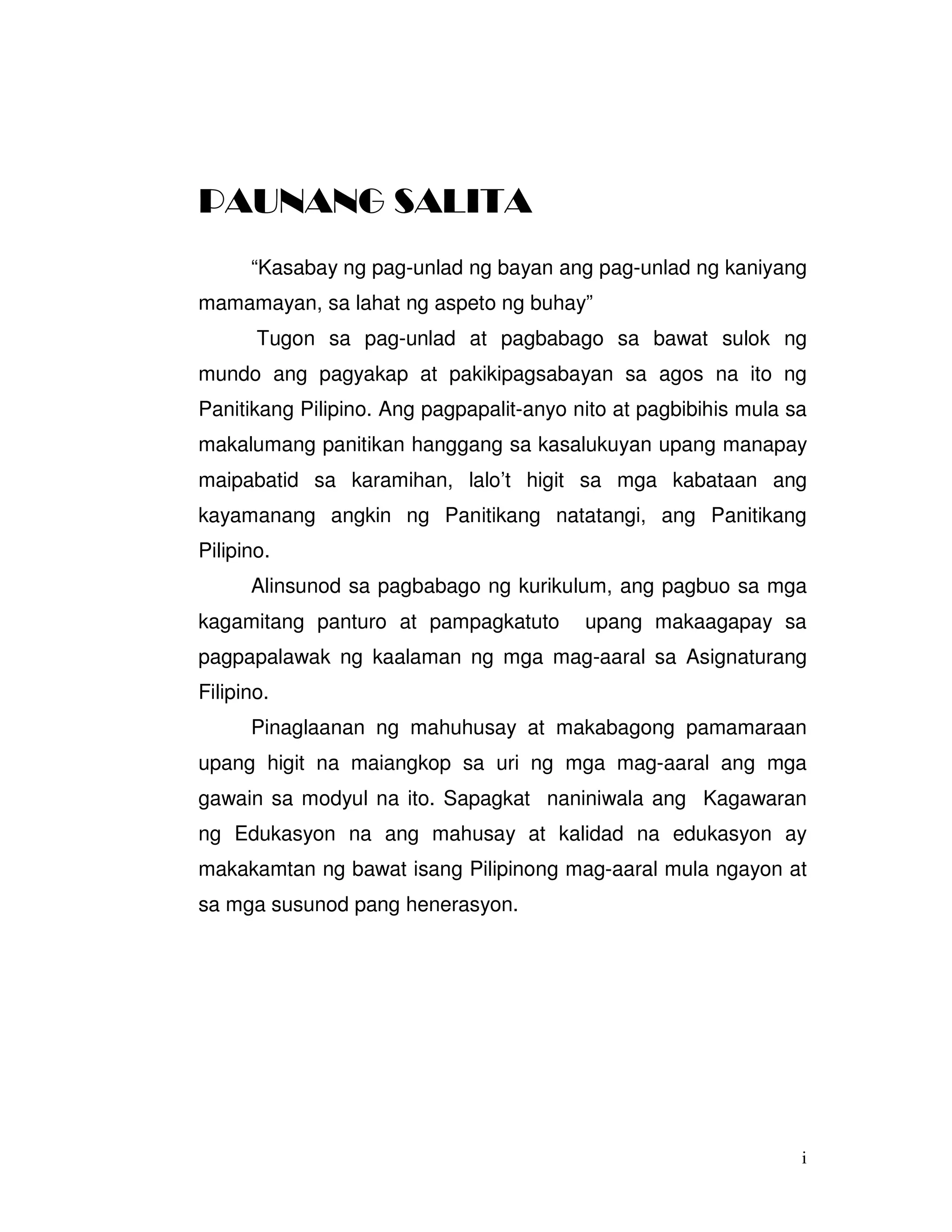 Ang dokumento ay isang modyul na tumatalakay sa pag-unlad ng panitikang Pilipino sa iba't ibang panahon ng kasaysayan ng bansa, mula sa mga katutubo hanggang sa kasalukuyang panahon. Ipinapakita nito ang pagtatangka ng Kagawaran ng Edukasyon na mapalawak ang kaalaman ng mga mag-aaral sa asignaturang Filipino sa pamamagitan ng mga kagamitang panturo at mahuhusay na pamamaraan ng pagtuturo. Layunin din nitong linangin ang pagpapahalaga sa kulturang Pilipino at mga akdang pampanitikan na maaaring magsilbing salamin ng nakaraan at kasalukuyan.