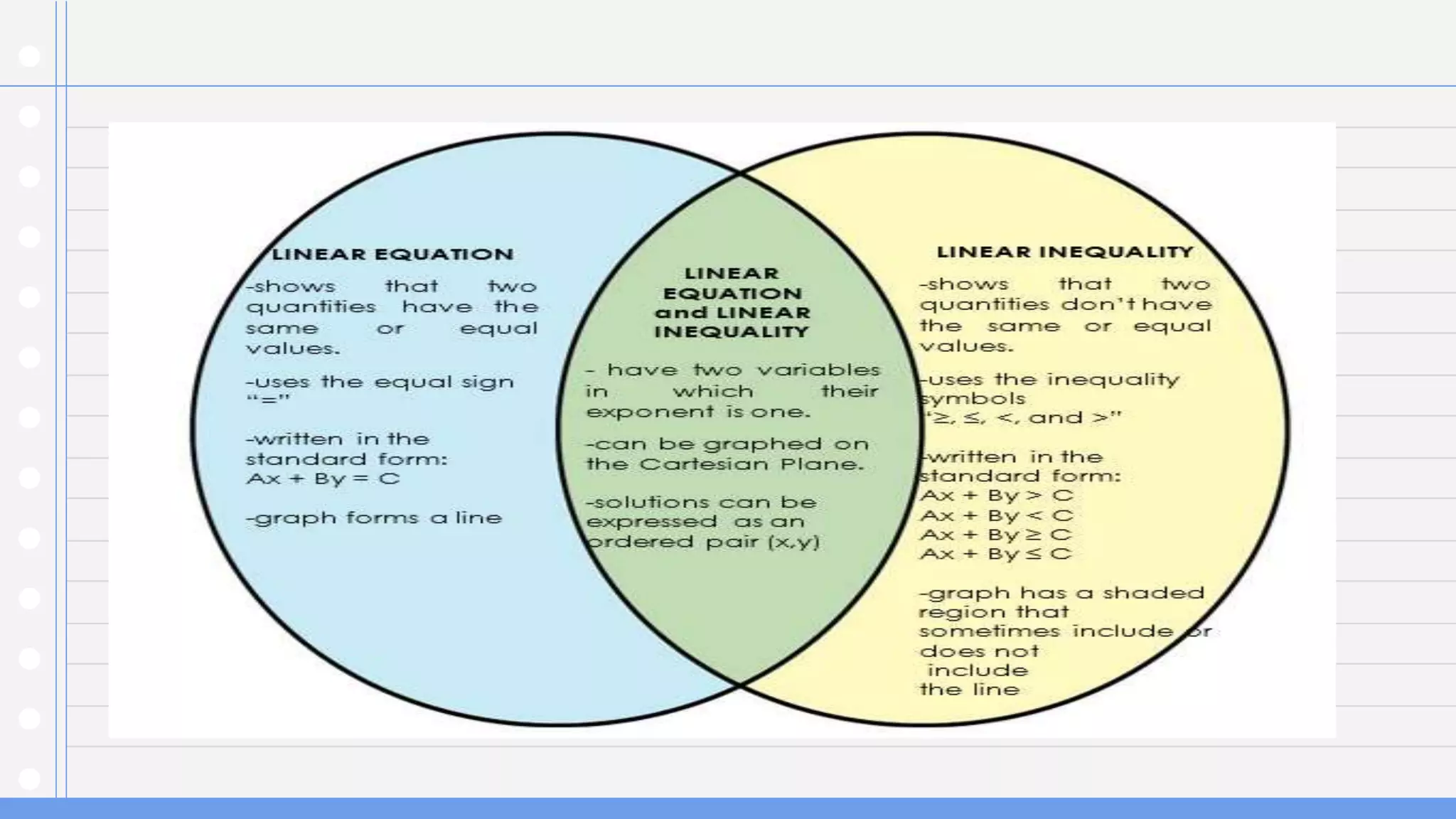 The document discusses linear inequalities in two variables. It defines a linear inequality as similar to a linear equation, except the equals sign is replaced with an inequality symbol. Examples of linear inequalities in two variables are provided. The key steps for illustrating and graphing linear inequalities in two variables are outlined, including changing the inequality to an equation, finding the boundary line using x- and y-intercepts, determining whether the boundary line is solid or broken based on the inequality symbol, using a test point to determine which region is shaded, and drawing the final graph showing the shaded solution region.