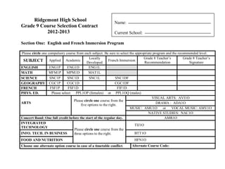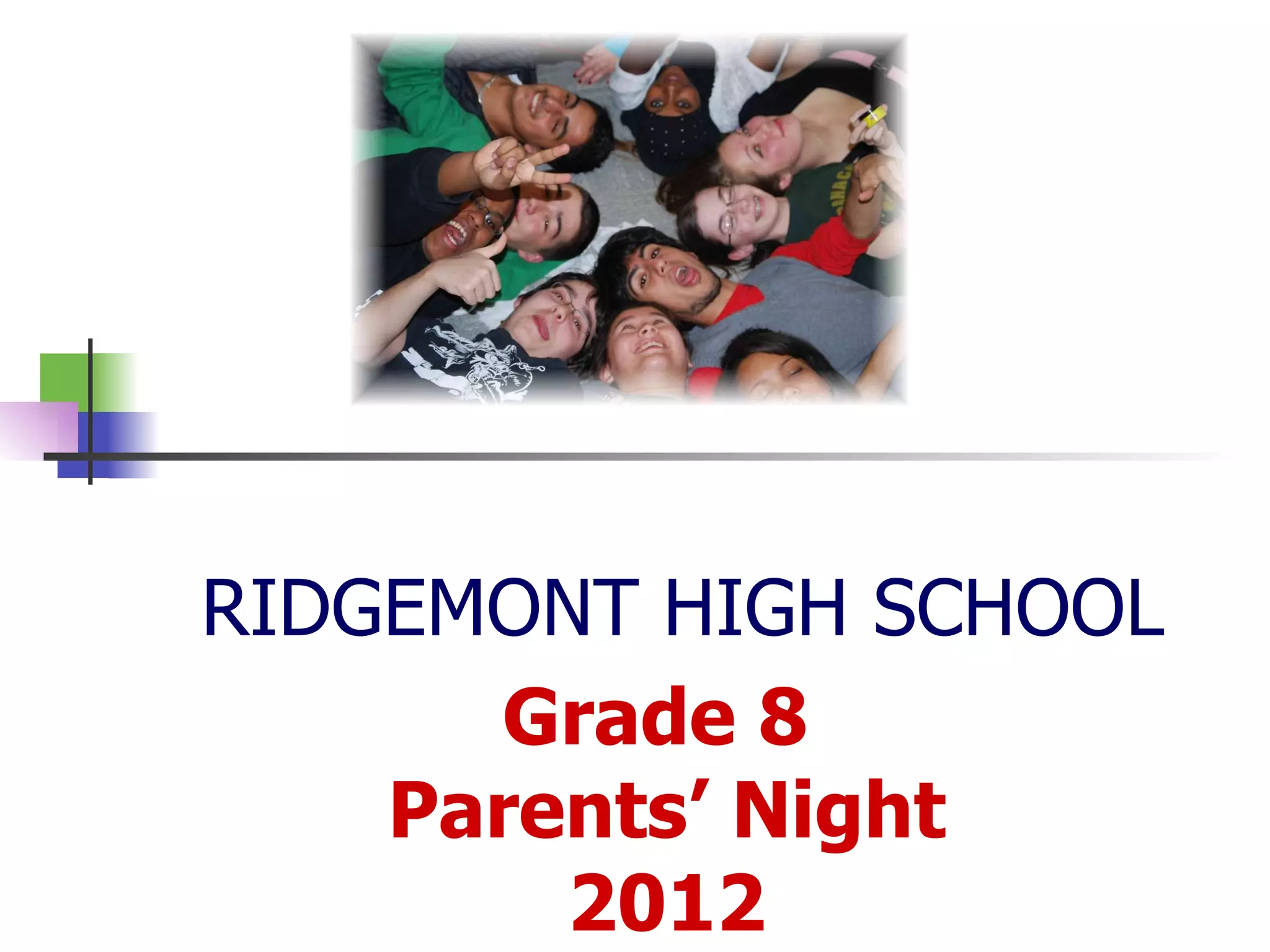 The document provides an agenda and information for a Grade 8 Parents' Night at Ridgemont High School. It outlines the various course and program options available to students in Grade 9, including academic, applied, and essential streams for core subjects like math, science, and English. It also highlights extracurricular activities like arts, athletics, clubs and the peer mentoring program. The document aims to help parents learn about pathways and course selections for their children as they transition to high school.