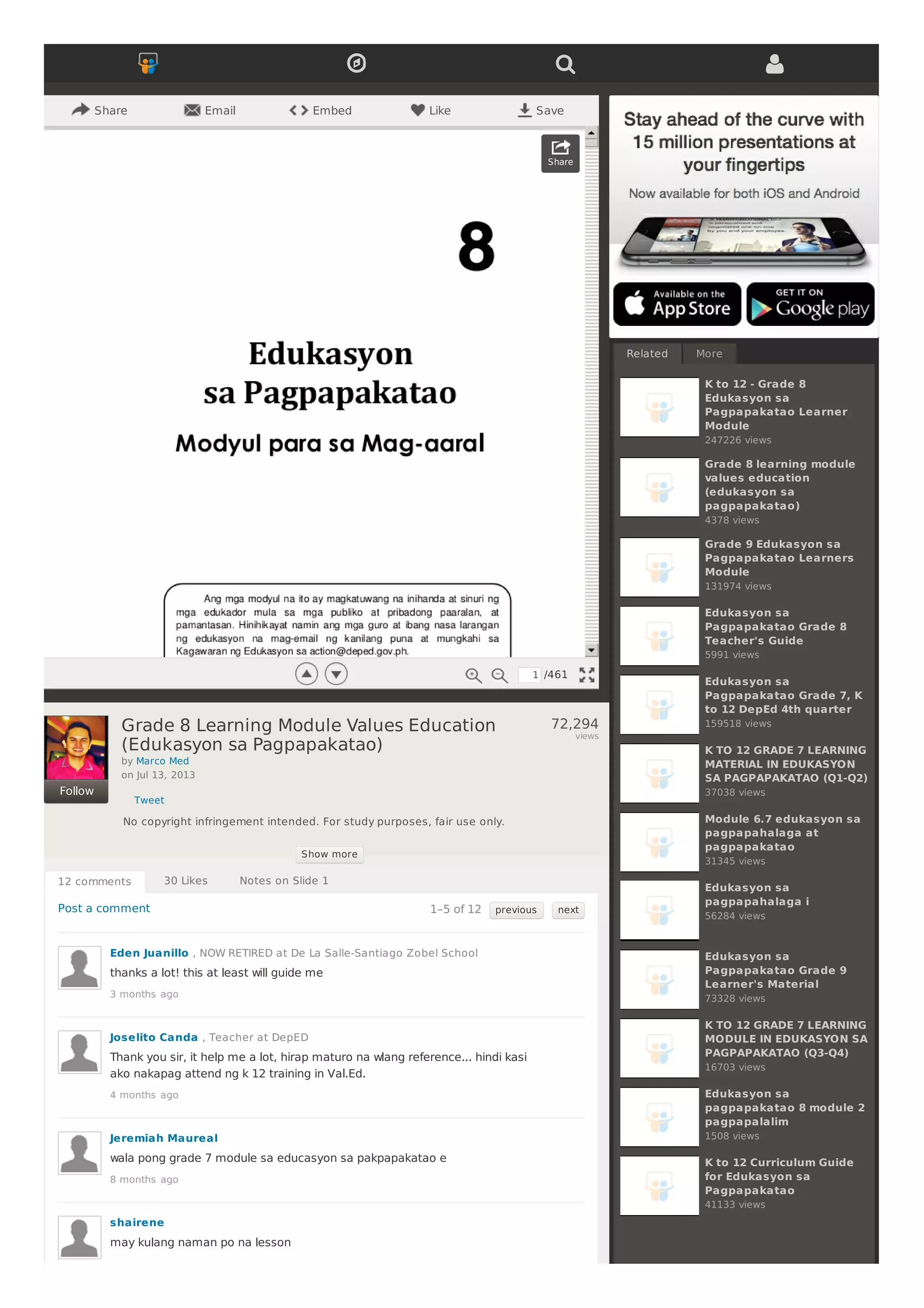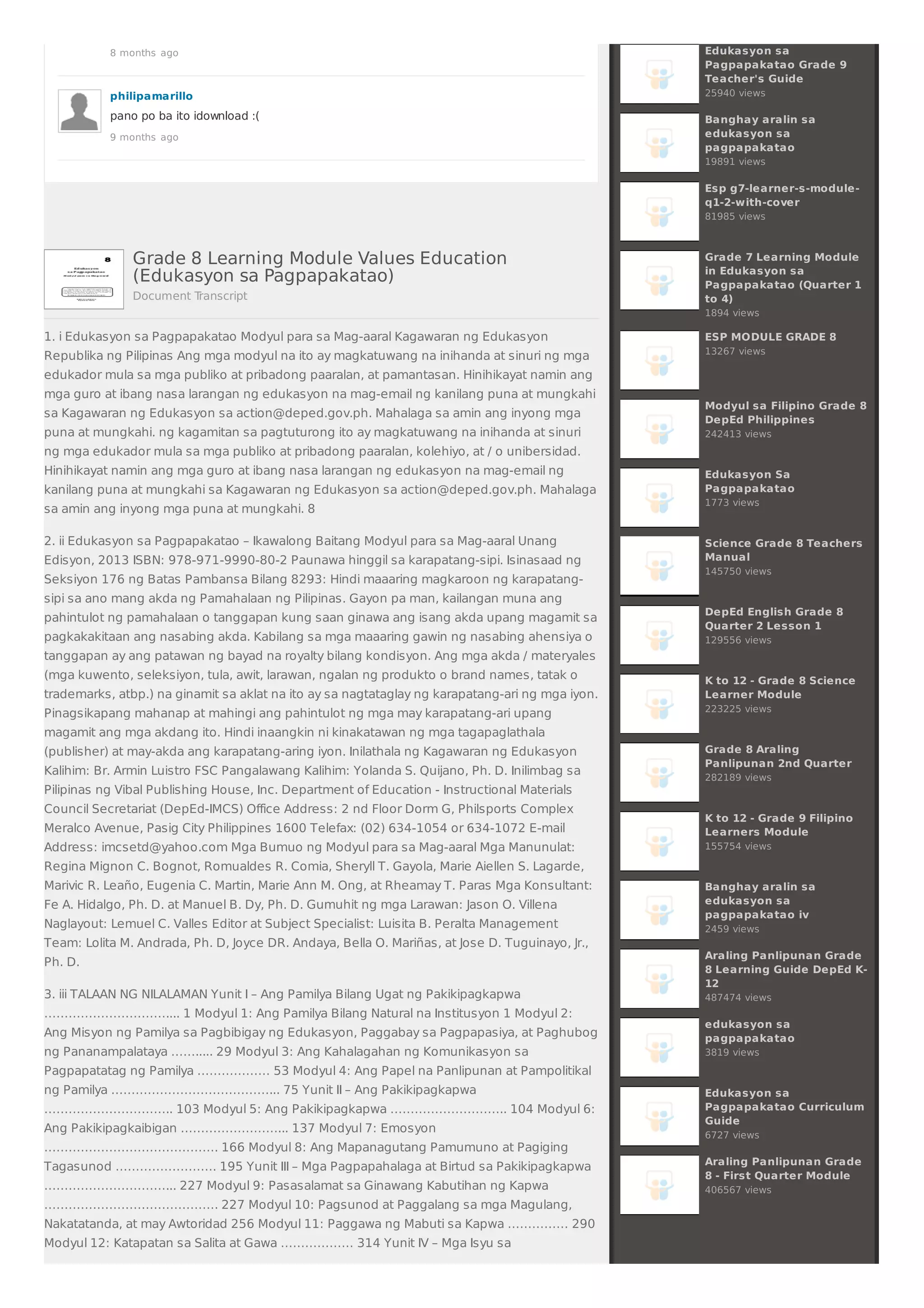 Ang dokumentong ito ay isang modyul para sa ika-walong baitang sa asignaturang Edukasyon sa Pagpapakatao na inihanda ng Kagawaran ng Edukasyon ng Pilipinas. Layunin ng modyul na ito na tulungan ang mga mag-aaral na maunawaan ang kahalagahan ng pamilya bilang isang natural na institusyon at ang mga pagpapahalaga at birtud na nagmumula sa pakikipagkapwa. Naglalaman ito ng mga aralin na nagbibigay-diin sa komunikasyon, pagmamahalan, at pakikipagtulungan sa loob ng pamilya.