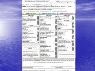 This document provides information for grade 9 students and parents about pre-registration for grade 10 at Tisdale Middle & Secondary School. It outlines the school's semester schedule, class periods, available programs, and graduation requirements. It also describes course options in math, science, and other subject areas for grades 10-12. Students are given a three-year planning guide to help meet core curriculum requirements. The document lists extracurricular clubs and activities students can participate in.
