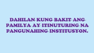 Ang dokumento ay naglalarawan ng kahalagahan ng pamilya bilang pangunahing institusyon ng lipunan na nabuo sa pagmamahalan at nagtutulungan. Sinasalamin nito ang mga tungkulin ng pamilya sa pagbibigay ng edukasyon, moral na paghubog, at suporta sa mga kasapi. Binibigyang-diin din ang responsibilidad ng mga kabataan sa pagbuo at pagtataguyod ng kanilang sariling pamilya.
