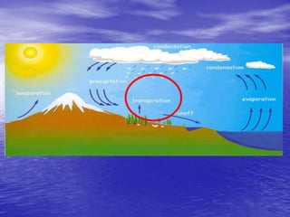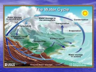 The water cycle is a continuous process that circulates water through the atmosphere, ocean, and land, powered by solar energy. It includes stages like evaporation, transpiration, condensation, and precipitation, where water transforms from liquid to vapor and back again. This cycle is essential for sustaining life on Earth, as it regulates water availability across different environments.