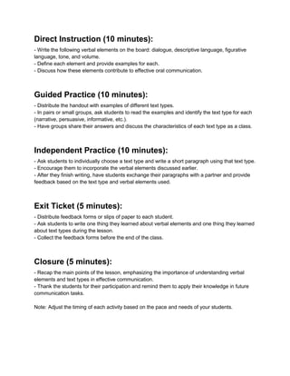 The lesson plan focuses on teaching 5th grade students about verbal elements in oral communication such as dialogue, descriptive language, figurative language, tone, and volume. It also teaches students to identify different text types (narrative, persuasive, informative) and their key characteristics. Students practice identifying text types in examples and incorporating verbal elements in their own writing. They provide feedback to peers on the use of text types and verbal elements.