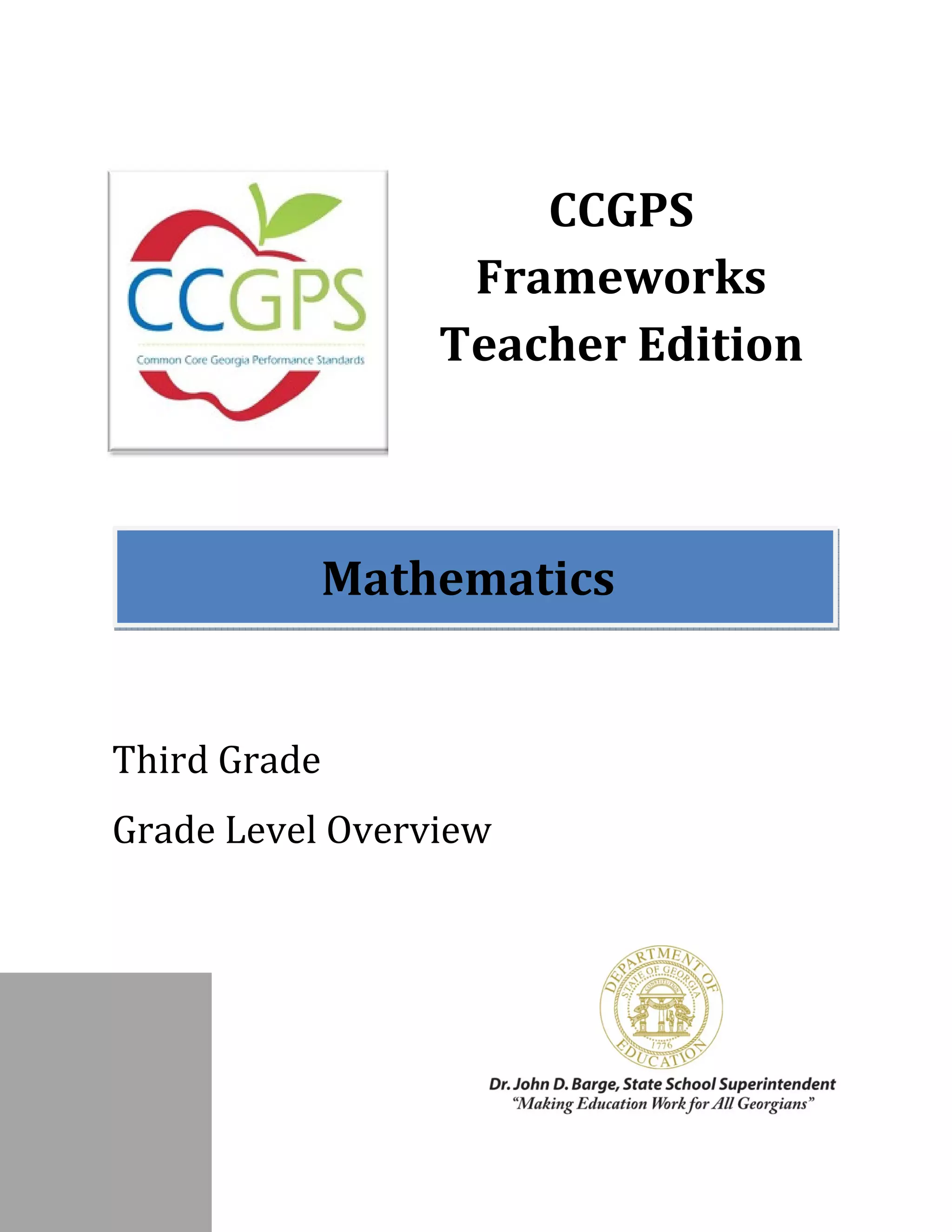 This document provides an overview of the third grade mathematics curriculum based on the Common Core Georgia Performance Standards. It includes information on the standards for mathematical practice, content standards, curriculum maps, unpacking the standards, lesson planning frameworks, and additional resources. The content standards are organized into 8 units covering various domains including numbers and operations in base ten, operations and algebraic thinking, measurement and data, and geometry.