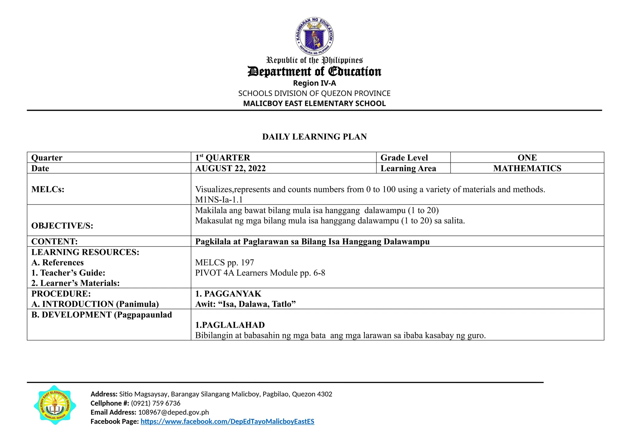 Date AUGUST 22, 2022 Learning Area MATHEMATICS