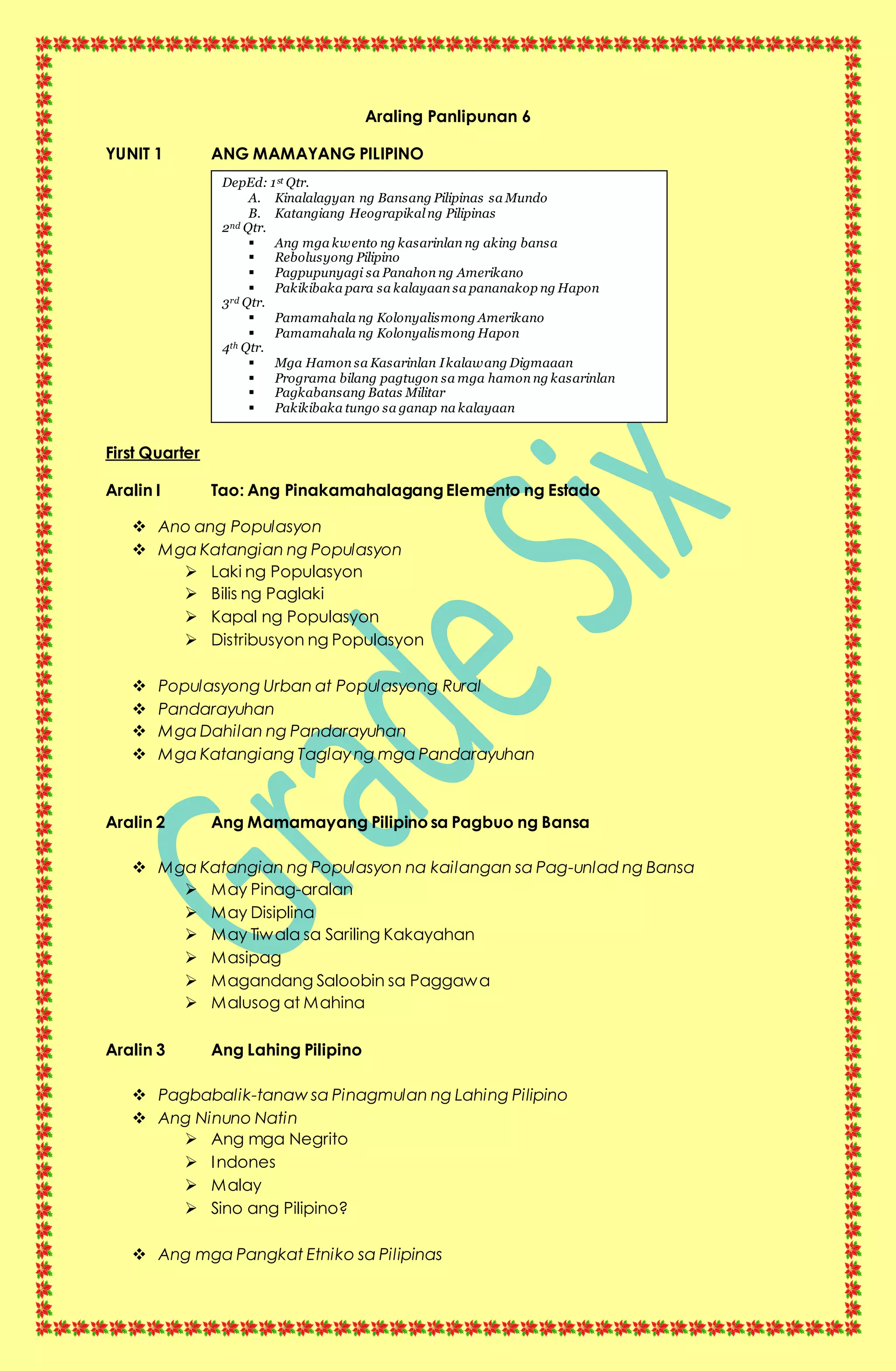 Ang dokumentong ito ay isang kurikulum sa Araling Panlipunan para sa ika-anim na baitang, na tumatalakay sa mga pangunahing paksang may kinalaman sa mamayang Pilipino, tulad ng populasyon, mga lahi, at mga katangiang kailangan para sa pag-unlad ng bansa. Ito ay nahahati sa mga yunit na naglalaman ng mga aralin na sumasaklaw sa kasaysayan, teritoryo, pamahalaan, at pag-unlad ng bansa. Kabilang dito ang mga pag-aaral sa mga likas na yaman, mga batayang karapatan at tungkulin ng mamamayan, at mga hamon sa pag-unlad ng bansa.