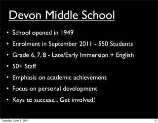 Devon Middle School is a school for grades 6-8 with an enrollment of 550 students that opened in 1949. It focuses on academic achievement and personal development, with an emphasis on improving math and language arts performance. The school encourages students to get involved through various programs, clubs, and sports activities. It provides a supportive learning environment to help students become lifelong learners and productive community members.