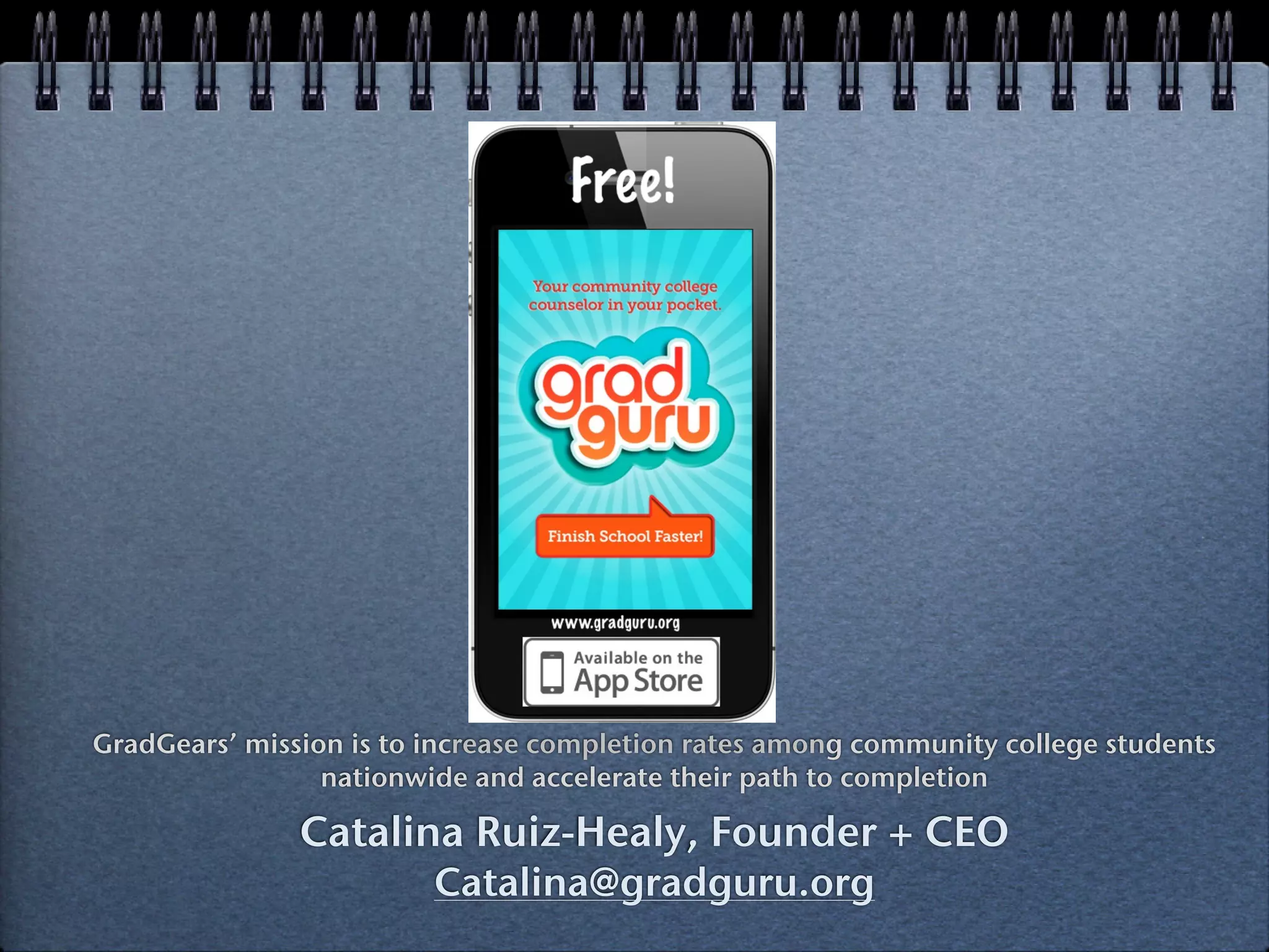 GradGears' mission is to increase community college completion rates nationwide through a mobile platform called GradGuru that informs, motivates, and connects students to help them make better decisions to finish school faster. The platform provides students with deadlines, tasks, nudges based on evidence-based behaviors, and peer support through a social network feature. It aims to be a cost-efficient and scalable way for community colleges to improve completion rates given limited resources like advisors. The founder has outlined plans for user acquisition, product releases, revenue streams, expenses, milestones, and potential impact on completion timelines and fees saved by students.
