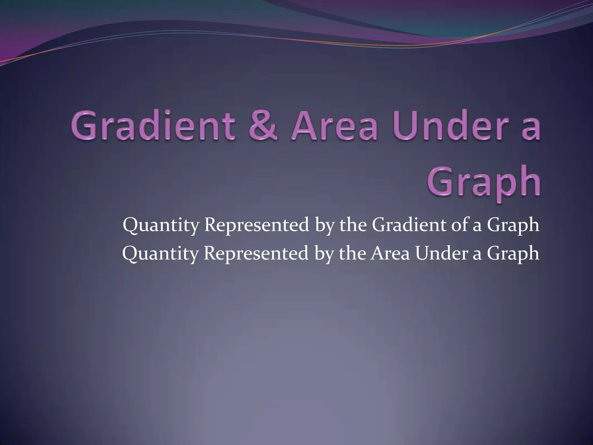The document discusses quantities represented by gradients and areas under graphs. The gradient of a distance-time graph represents speed, as it is the rate of change of distance with respect to time. The area under a speed-time graph represents distance, as area is the product of speed (y-axis) and time (x-axis). An example distance-time graph is given to illustrate a scenario of traveling between locations over time.