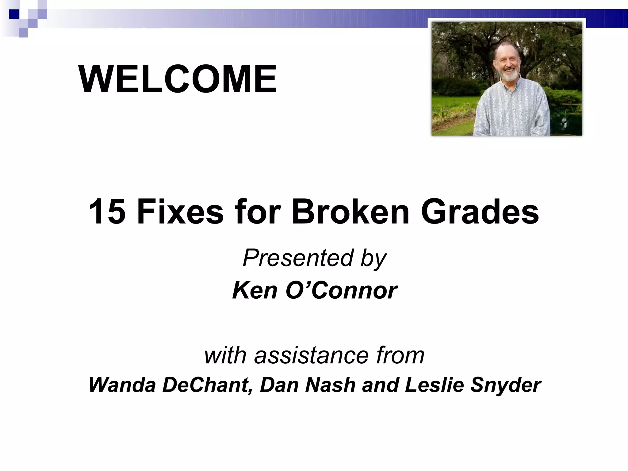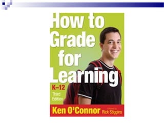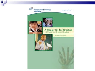 This document provides an overview of a presentation on 15 fixes for broken grades. The presentation is given by Ken O'Connor with assistance from three others. It defines key terms related to grading like marks, scores, and grades. It also discusses the purposes of grading and issues that can make grades broken if they distort achievement, are of low quality, involve inappropriate calculations, or don't support learning. Fifteen specific fixes are proposed to address these issues, and participants are invited to discuss the fixes.