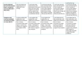 This document outlines a rubric for evaluating writing skills across several categories on a scale of 1 to 5. The categories include finding and using evidence to support a viewpoint, accurately citing quotes, using MLA formatting, developing a thesis statement, providing supporting arguments, locating relevant factual information from multiple sources, and comparing and contrasting multiple accounts of a topic while using evidence. For each category, it describes the skills demonstrated at each level on the scale.