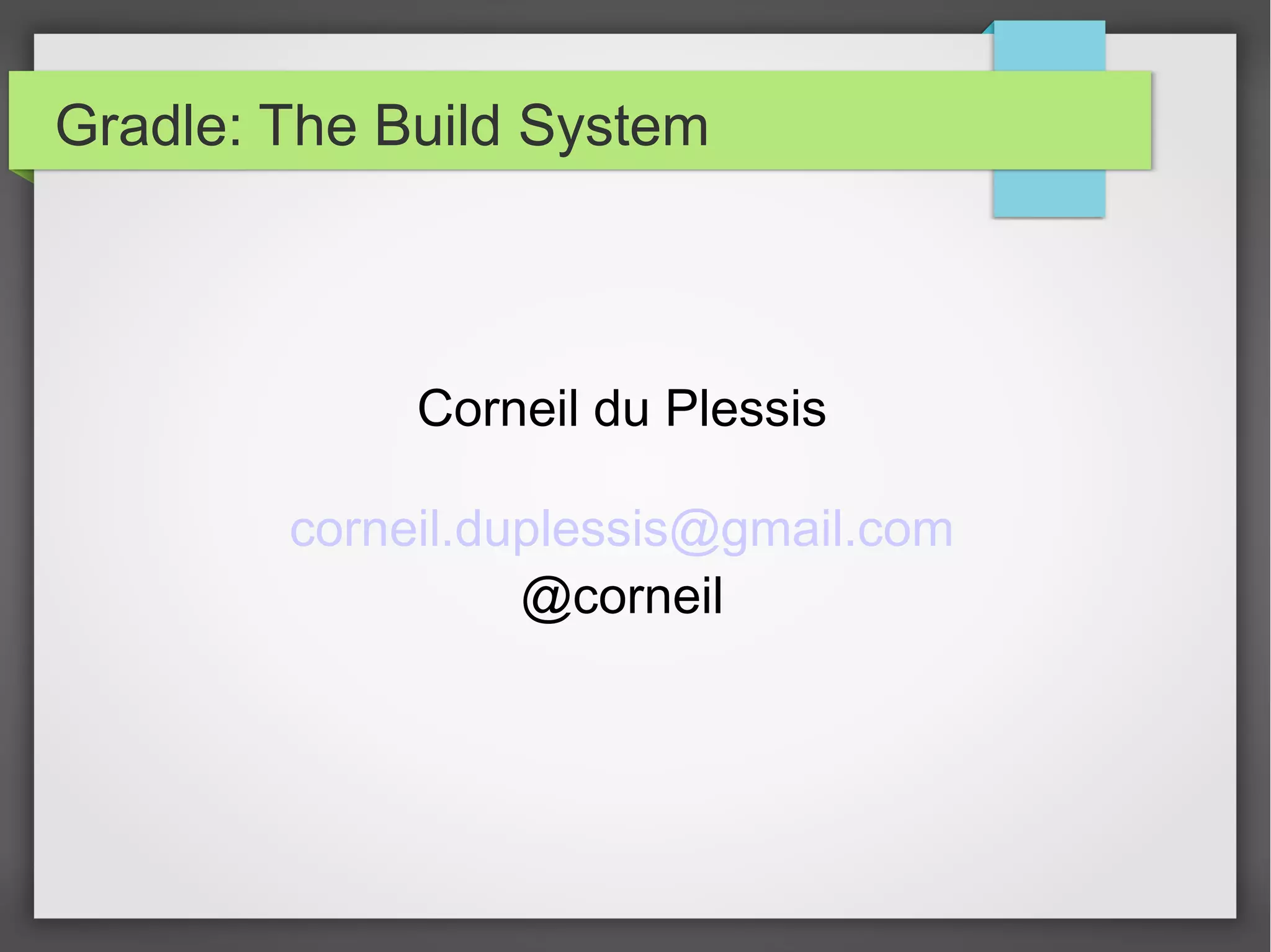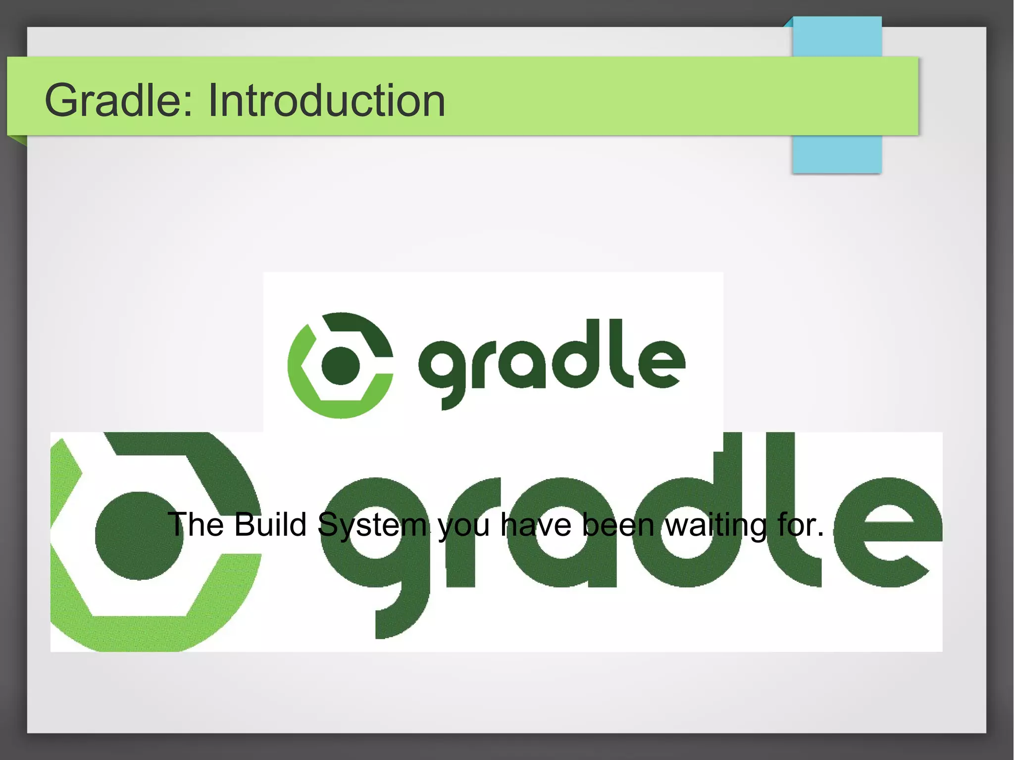 The document provides an overview of Gradle, a build system that integrates functionalities from Make, Ant, and Maven. It covers Gradle's features, including its Groovy DSL for build scripts, compatibility with existing build tools, and its ability to manage dependencies and tasks. Additionally, it details sample build configurations and demonstrates Gradle's capabilities through the creation of different project types and the use of third-party plugins.
