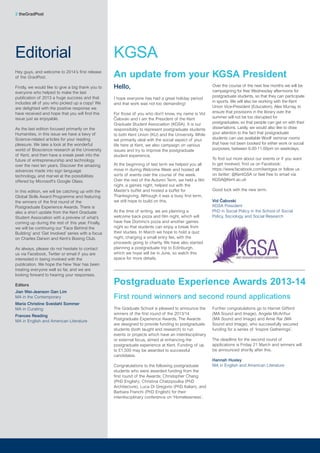 This document provides a summary of the first issue of the University of Kent's graduate student newsletter, the GradPost. It includes updates on events from the Kent Graduate Student Association, winners of the Postgraduate Experience Awards, and previews of articles on Charles Darwin and the future of technology. The editors welcome feedback and involvement from graduate students.