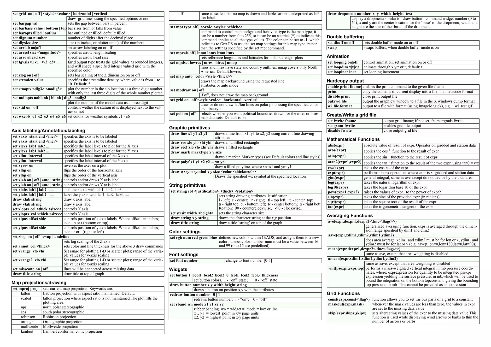 This document provides a reference card for commands and settings in GrADS (Grid Analysis and Display System) version 1.7. It lists GrADS program executables, command line options, general settings, dimension environments, page control, graphic types, default colors and styles, and commands for graphics, axes, maps, strings, buttons, double buffering and animation.