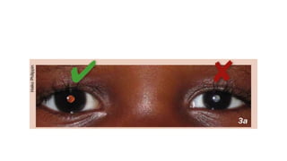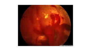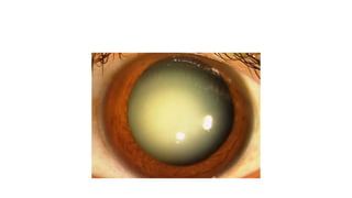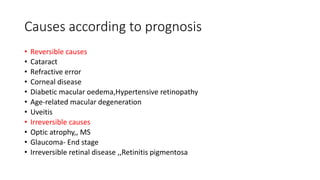 This document discusses the gradual causes of visual loss, including both reversible and irreversible causes. Reversible causes include cataract, refractive error, corneal disease, diabetic macular edema, age-related macular degeneration, and uveitis. Irreversible causes include optic atrophy, multiple sclerosis, end-stage glaucoma, and retinitis pigmentosa. A thorough history and clinical examination focusing on visual acuity, pupil testing, red reflex, fundoscopy, and visual field testing is needed to diagnose the cause. Appropriate management can reverse some conditions, while others may become permanent if not treated.