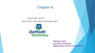 The document discusses gradually varied flow in water resources engineering, detailing governing equations for different flow conditions, including backwater and drawdown curves. It classifies flow regions and profiles based on channel slopes and provides practical examples of various flow profiles related to obstructions and transitions in channels. Key concepts include critical and normal depth lines, along with their implications for flow behavior in mild, steep, and adverse slopes.