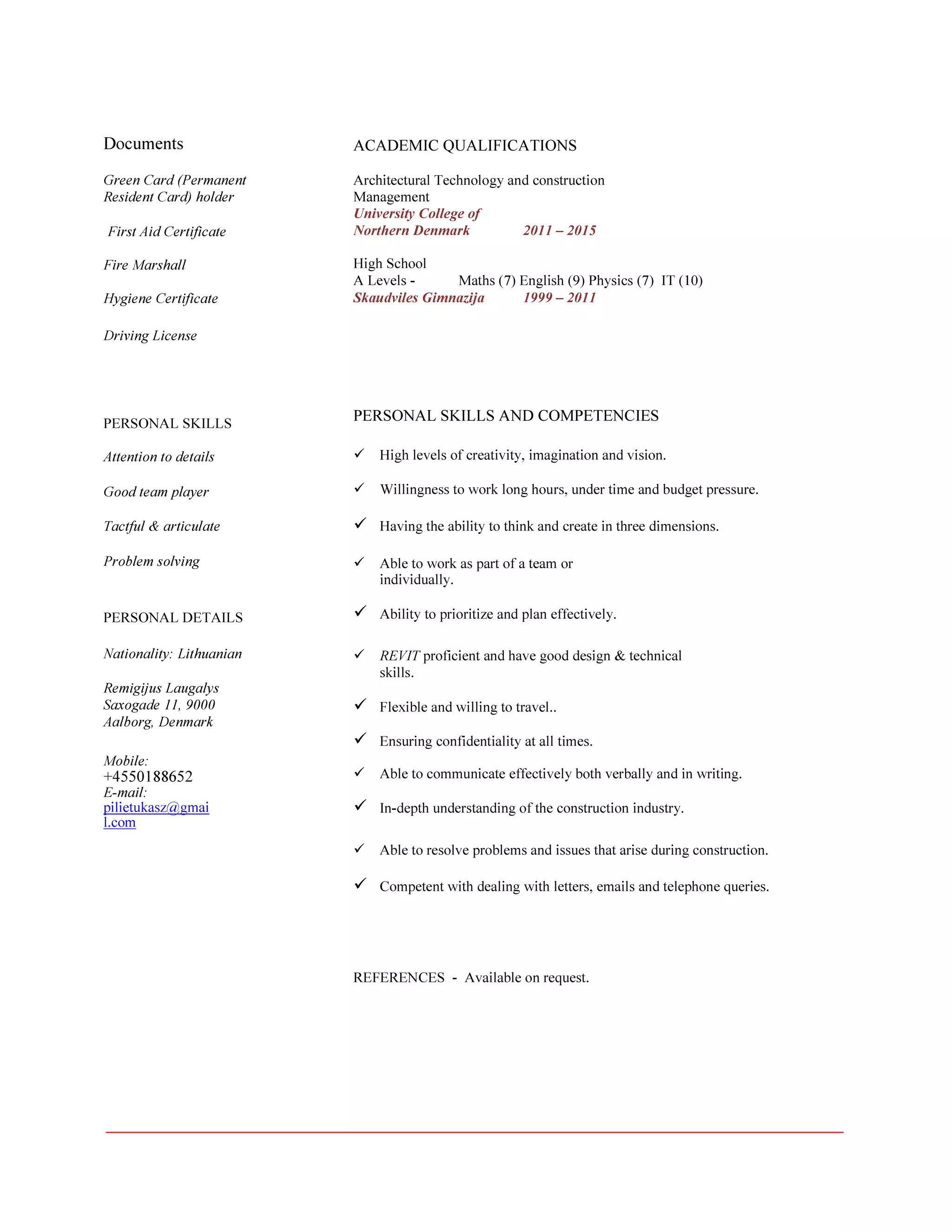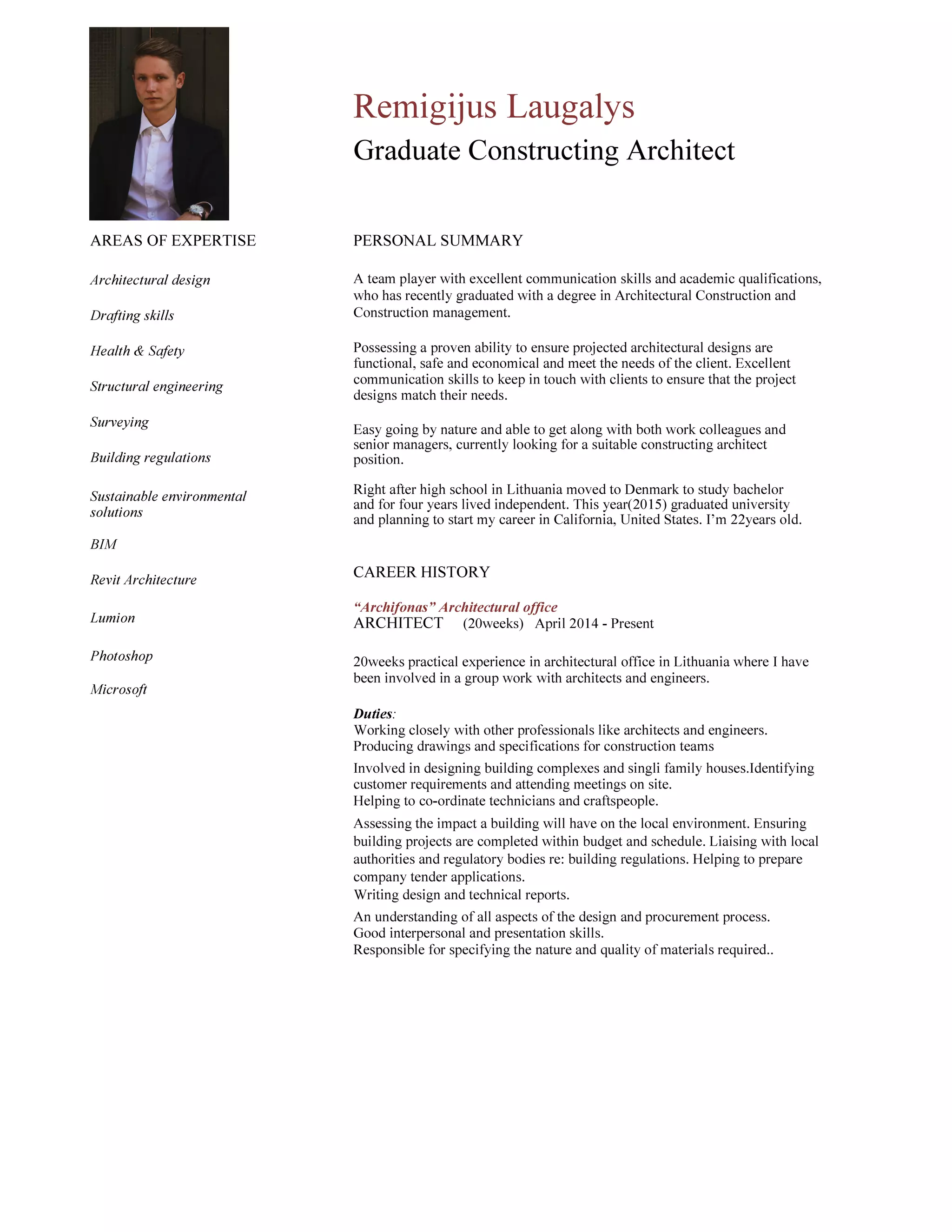 This document is a resume for Remigijus Laugalys, a recent graduate with a degree in Architectural Construction and Construction Management. He has 20 weeks of experience working as an architect at an architectural office in Lithuania. His skills include architectural design, drafting, structural engineering, sustainability, and BIM software like Revit and Lumion. He is looking for a position as a constructing architect in California.
