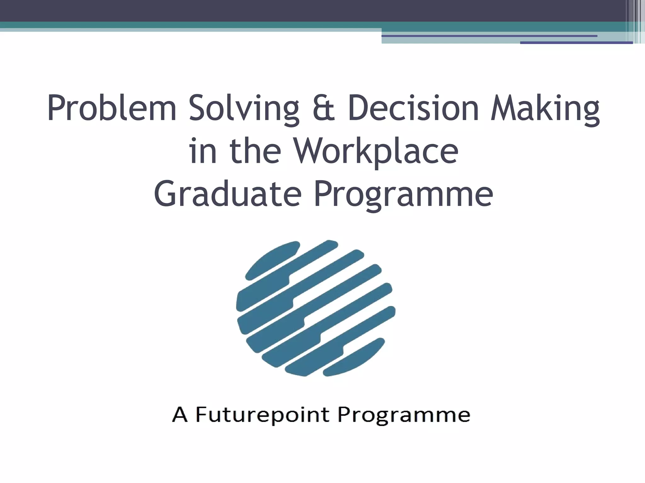 This document provides an overview of problem solving and decision making for supervisors. It discusses identifying problems in the workplace, using problem solving models like the 6 step approach and fishbone analysis to determine root causes. Effective problem solvers are confident, flexible, and learn from mistakes. Decision making involves defining problems, gathering information from stakeholders, developing alternatives, and selecting the best option. Involving teams in decisions improves morale but takes more time. Supervisors must determine when individual or group decisions are most appropriate.