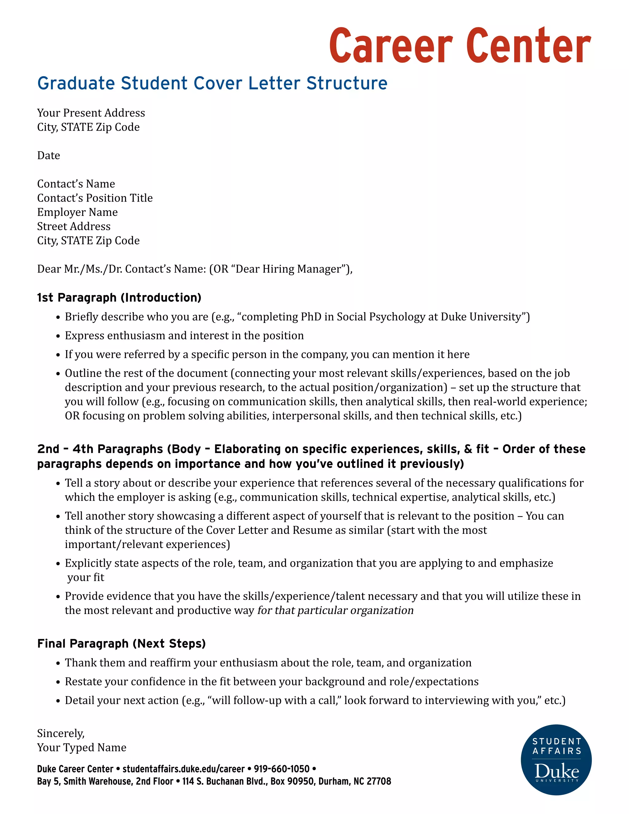 This document outlines the structure for a cover letter for graduate students, detailing how to introduce oneself, express interest, and connect relevant skills to the job description. It emphasizes the importance of storytelling to demonstrate qualifications and fit for the role, while also advising on concluding the letter by reaffirming enthusiasm and outlining next steps. The job description focuses on a Principal Data Analyst position requiring advanced data analysis skills, experience with significant datasets, and strong communication capabilities.