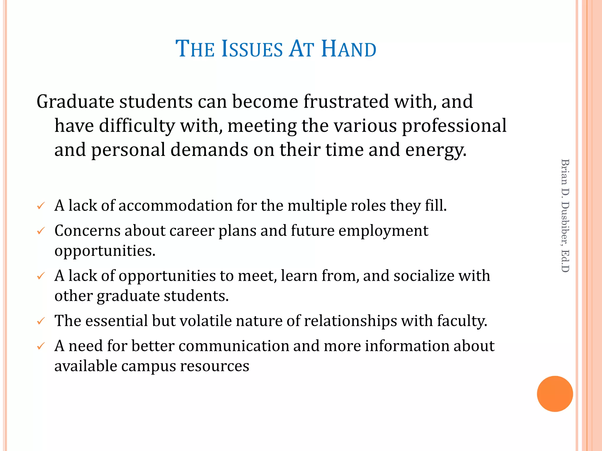 The document discusses the needs and challenges of graduate students and proposes services to address them. It notes that graduate students have multiple roles that lack accommodation, concerns about careers and employment, and need socialization to their professions. It recommends orientation programs, advising, counseling, career services, and other resources to help with professional development, writing skills, health, families, finances, and more. The goal is to support graduate students through their programs and socialize them into their desired professions.