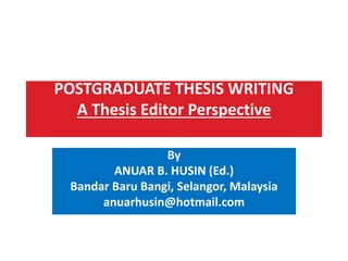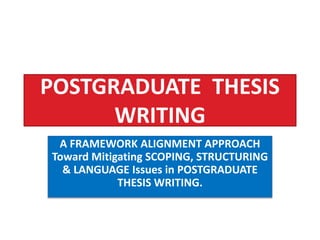 The document discusses a framework alignment approach for postgraduate thesis writing, addressing common issues related to scoping, structuring, and language. It emphasizes a systematic and creative process for developing cohesive and coherent theses while providing guidelines and paradigms to enhance the writing experience. The alignment of content, scope, structure, and language is crucial for producing a well-organized and meaningful academic research document.