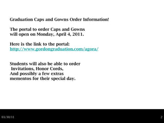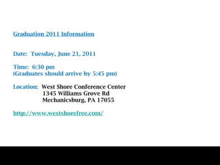 Graduation information is provided for 2011 including the date, time, and location of the ceremony which will be held on Tuesday, June 21 at 6:30 pm at the West Shore Conference Center in Mechanicsburg, PA. Information is also given on ordering caps and gowns through an online portal opening on April 4th, where students can also order invitations, honor cords, and other graduation memorabilia.
