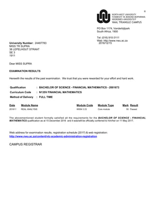 The document provides a student's examination results, including a web address for future registration information. It details that the student passed their REAL ANALYSIS WISN 3 module with a mark of 55, satisfying the requirements for a BACHELOR OF SCIENCE IN FINANCIAL MATHEMATICS to be conferred on May 11, 2017. Contact information is also included for the University.