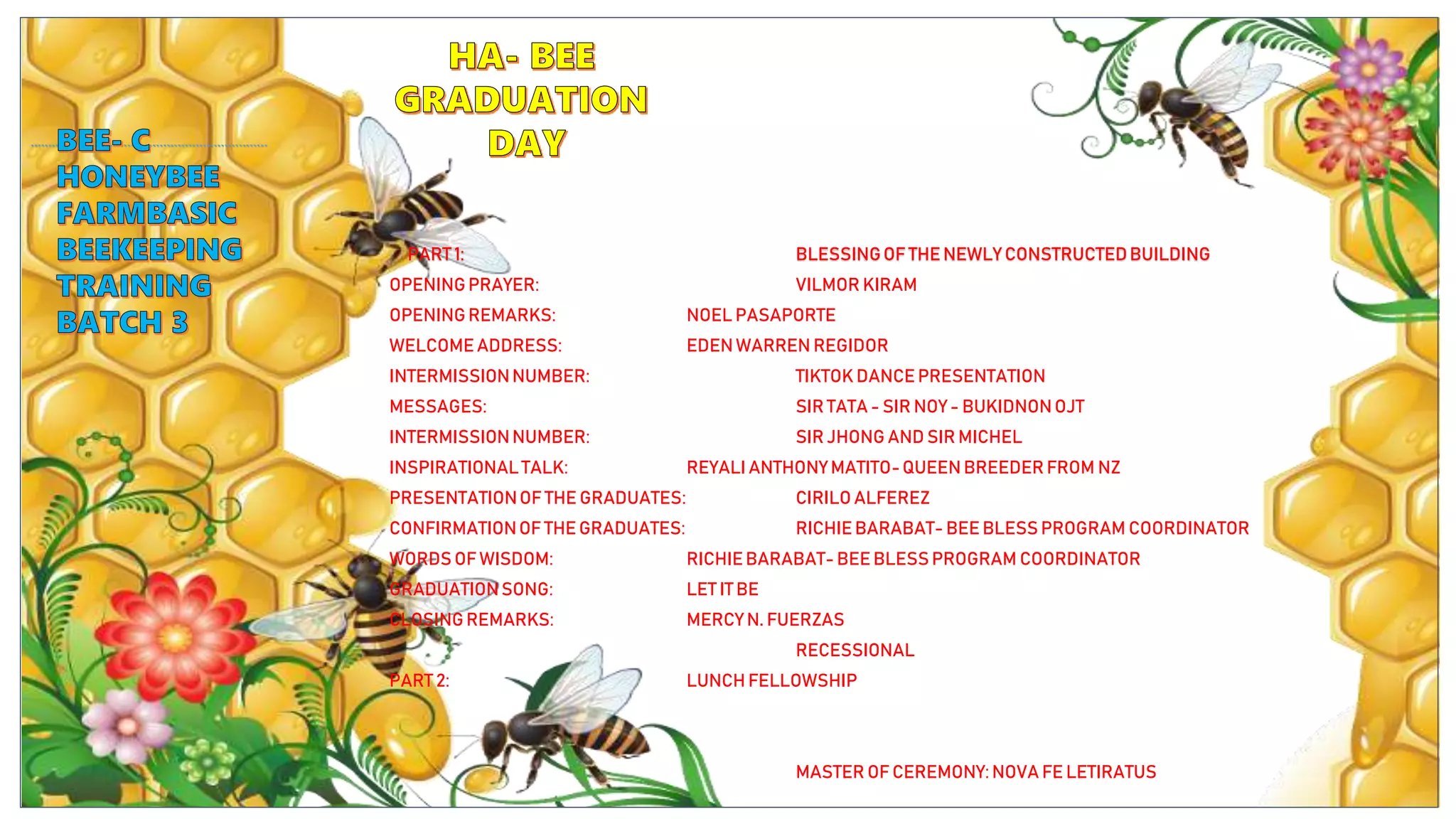 This document outlines the agenda for an event with two parts: a building blessing ceremony with opening and closing prayers, remarks, performances, and a graduation ceremony; followed by a lunch fellowship with a master of ceremonies. Key elements included an inspirational talk, presentation and confirmation of graduates, and words of wisdom for the new graduates.