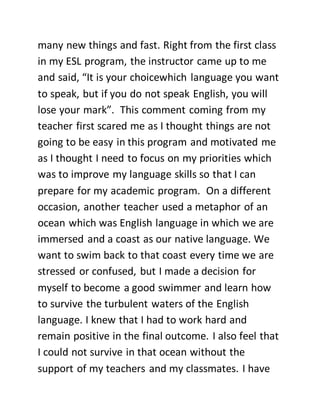 Vicky Liu represents her graduating class from the Summer 2011 ESL program. She shares her story of arriving in Canada from China in December and joining the ESL program in January. She discusses the diversity of her classmates from different countries and cultures, and how she had to work hard and learn quickly to succeed in the program. Her teachers motivated and encouraged the students to never give up, and helped them gain confidence and skills for future academic success. Vicky is thankful for the support of her teachers and classmates, and feels more prepared to take on future academic challenges.