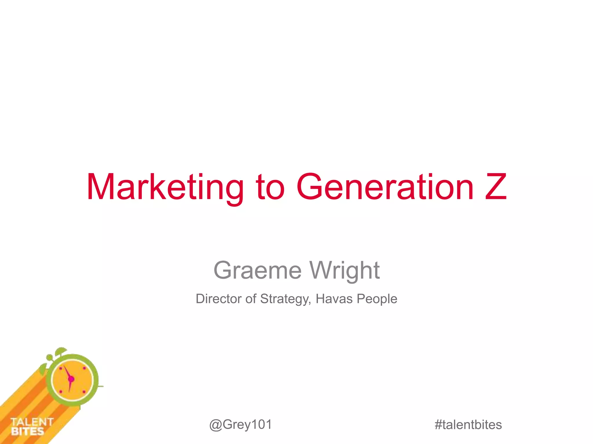 This document discusses strategies for marketing to Generation Z. It notes that Gen Z is the first truly global generation that has grown up with technology and social media. They have short attention spans and prefer visual, snackable content. Effective strategies for reaching Gen Z include creating short-form visual content for social media, collaborating with online influencers, maintaining an authentic human element, and providing easily researchable information about brands.