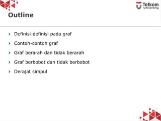 Dokumen ini membahas tentang struktur data graf, termasuk definisi, jenis graf (berarah, tidak berarah, berbobot, tidak berbobot), dan konsep dasar seperti simpul, busur, derajat simpul, serta contoh graf. Diperkenalkan pula istilah-istilah seperti path, closed path, dan circuit dalam konteks graf. Terdapat penjelasan mengenai graf sederhana, multigraf, dan graf lengkap beserta contoh-contohnya.