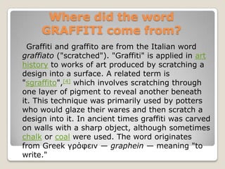 The document discusses the history and origins of graffiti. It traces graffiti back to ancient Rome, where political statements and satire were scratched onto walls. The word "graffiti" comes from the Italian word "graffiato," meaning scratched. While sometimes viewed as vandalism, graffiti has also been considered a form of art and political expression throughout history. Modern graffiti emerged in New York in the 1970s, where artists would tag trains as a way to gain exposure and mark their territory across the city. The document explores both the legal and illegal aspects of graffiti and provides tips for creating graffiti-style lettering on paper.