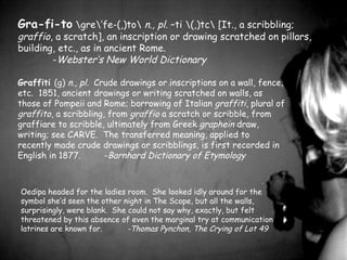 The document discusses the creation of a graffiti thesaurus to serve as a reference for terminology related to graffiti. It covers the process of gathering information from libraries, bookstores, and the internet. Some challenges included a lack of existing authoritative references and issues with terminology such as determining appropriate categories and hierarchies. The creator seeks feedback on language, categorization, and scope notes to improve the organizational structure and completeness of the thesaurus.