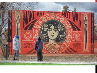 The document discusses graffiti, noting that it can be negative if it contains nasty, mean, or dirty words which can get one into legal trouble. However, graffiti can also be positive if it gets permission first or contains inspiring messages. The document profiles Keith Haring, a famous graffiti artist who turned his subway graffiti into legitimate art. It encourages students to create their own positive graffiti art by choosing an inspiring quote and recreating it using image software.
