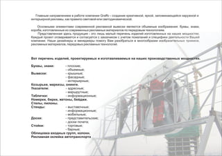 Компания Graffo занимается созданием креативной наружной и интерьерной рекламы, включая объемные вывески и световые буквы. Она предлагает широкий ассортимент продукции, включая таблички, стенды и козырьки, с использованием современных материалов и технологий. С момента своего основания в 1993 году, компания зарекомендовала себя как лидер в области внешней рекламы в России.