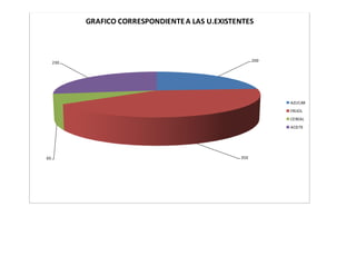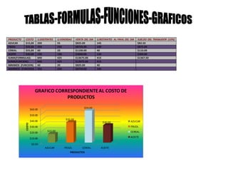 The document contains data on the cost, existing units, units sold, day sales, remaining units, and worker salary (10% of sales) for four products: sugar, beans, cereal, and oil. It also includes six graphs showing the corresponding data for cost, existing units, units sold, day sales, remaining units, and worker salary.