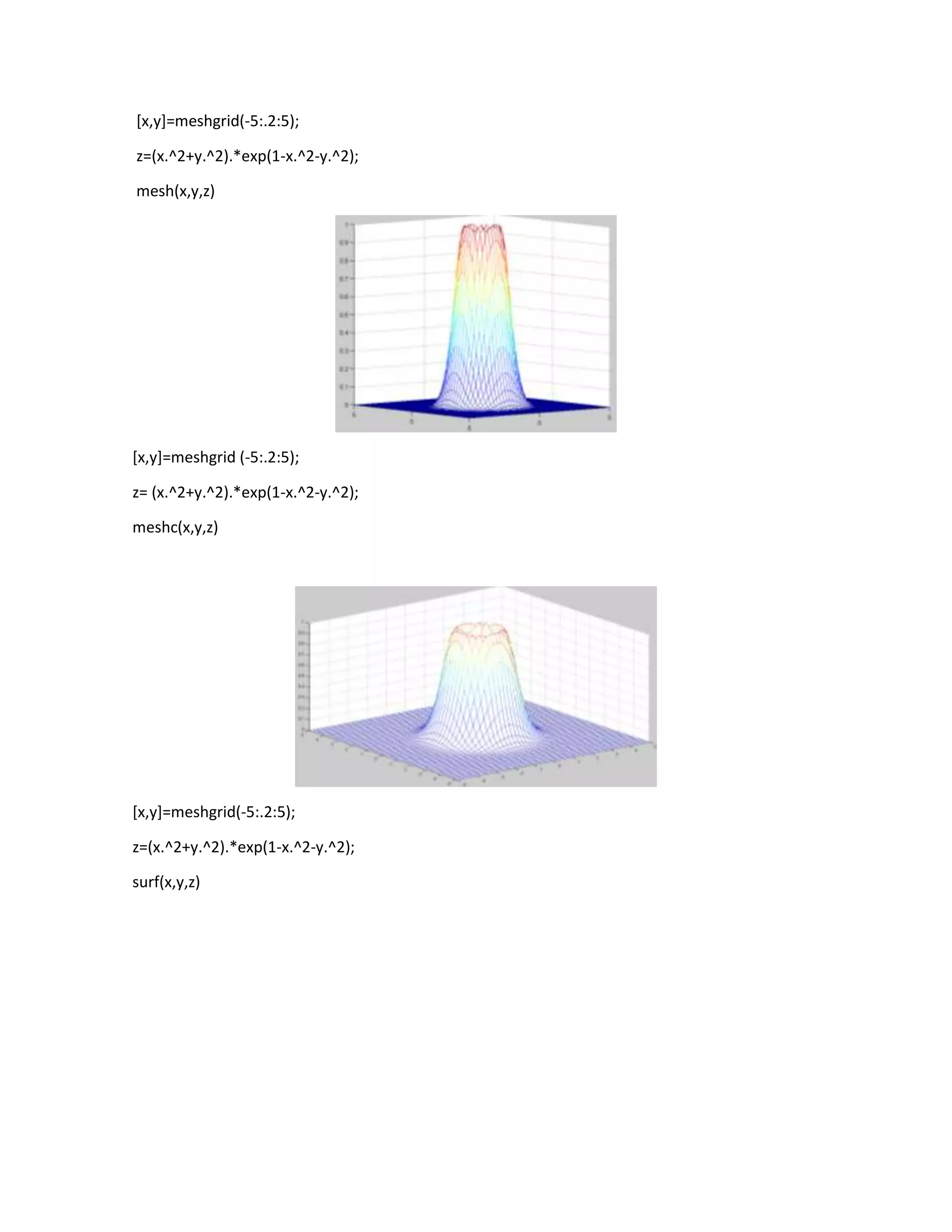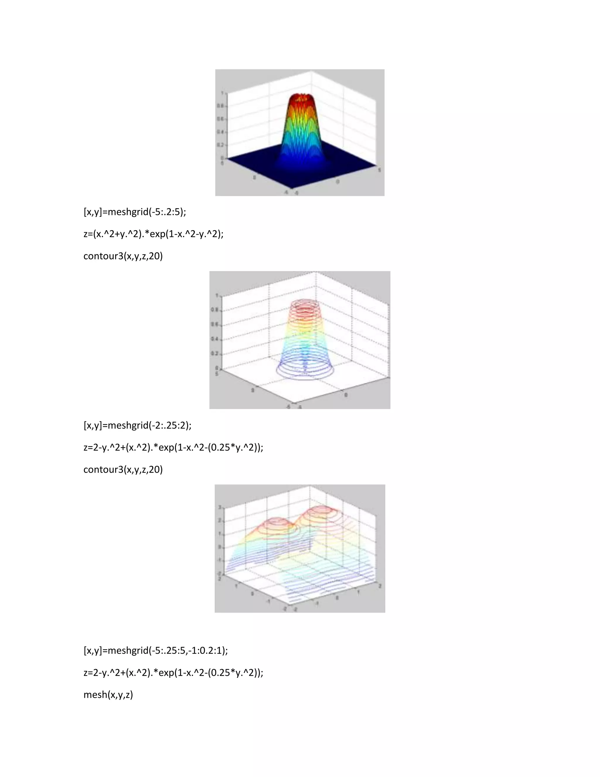 The document contains MATLAB code that generates various 3D surface and contour plots by defining x-y grids, calculating z-values as functions of x and y, and using functions like mesh, surf, contour3 to plot and visualize the surfaces. Different functions are used like mesh, meshc, surf, contour3 to plot the same surfaces in different visual styles. The z-values are defined as exponential, quadratic or trigonometric functions of x and y.
