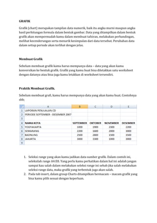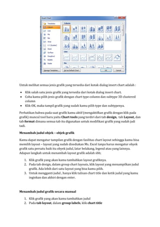 Dokumen ini membahas tentang pembuatan grafik (chart) untuk menampilkan data numerik secara visual guna mempermudah analisis dan perbandingan. Langkah-langkah untuk membuat grafik di Excel dijelaskan secara rinci, termasuk pemilihan data, jenis grafik, serta cara menambahkan judul dan label sumbu. Selain itu, terdapat informasi tentang modifikasi grafik menggunakan fitur yang tersedia di Excel.
