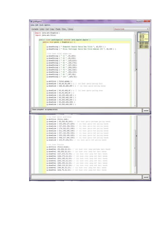 Dokumen ini adalah kode Java untuk menggambar grafik garis dan titik menggunakan komponen GUI AWT. Grafik tersebut terdiri dari beberapa garis dan oval yang menunjukkan nilai statistik dengan penjelasan tentang metode yang digunakan. Penulis adalah Hamim Suyuti dari Universitas Indraprasta PGRI dan dosen pengajar adalah Nahot Frastian.