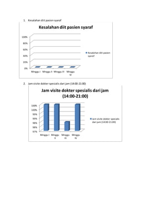 Grafik menunjukkan perkembangan 10 indikator kualitas layanan kesehatan selama 4 minggu berturut-turut, yaitu kepatuhan diet pasien syaraf, jam kunjungan dokter spesialis, kepatuhan terhadap clinical pathway, pelaksanaan readback yang ditandatangani, kepatuhan identifikasi saat transfusi darah, insiden jatuh pasien, kelengkapan assesmen pasien rawat inap dan IGD, identifikasi saat pemberian obat, serta presentasi kesalahan