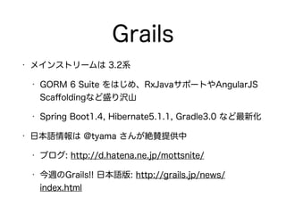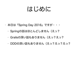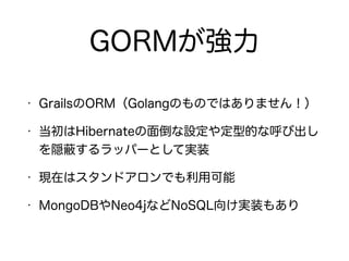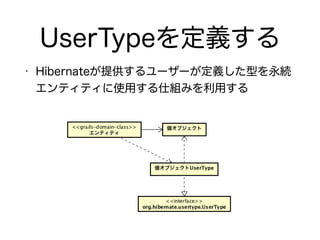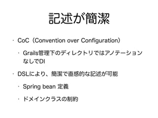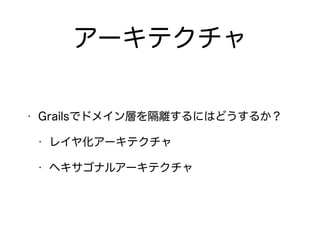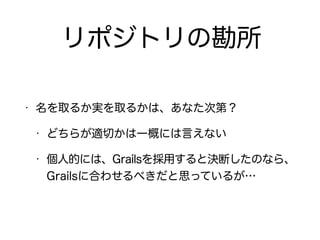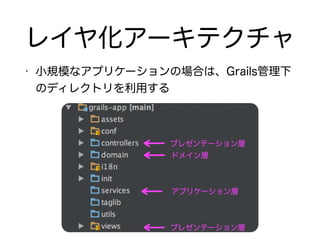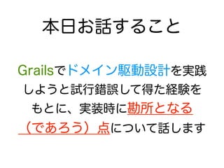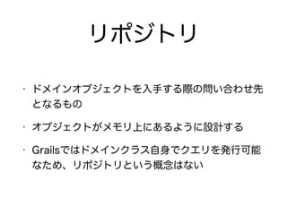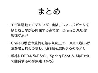 The document describes setting up a Grails application with domain classes, controllers, and MyBatis integration for database access. It includes: